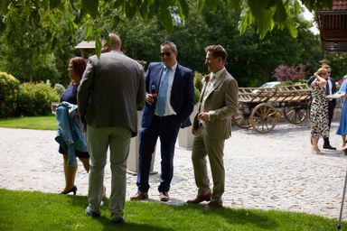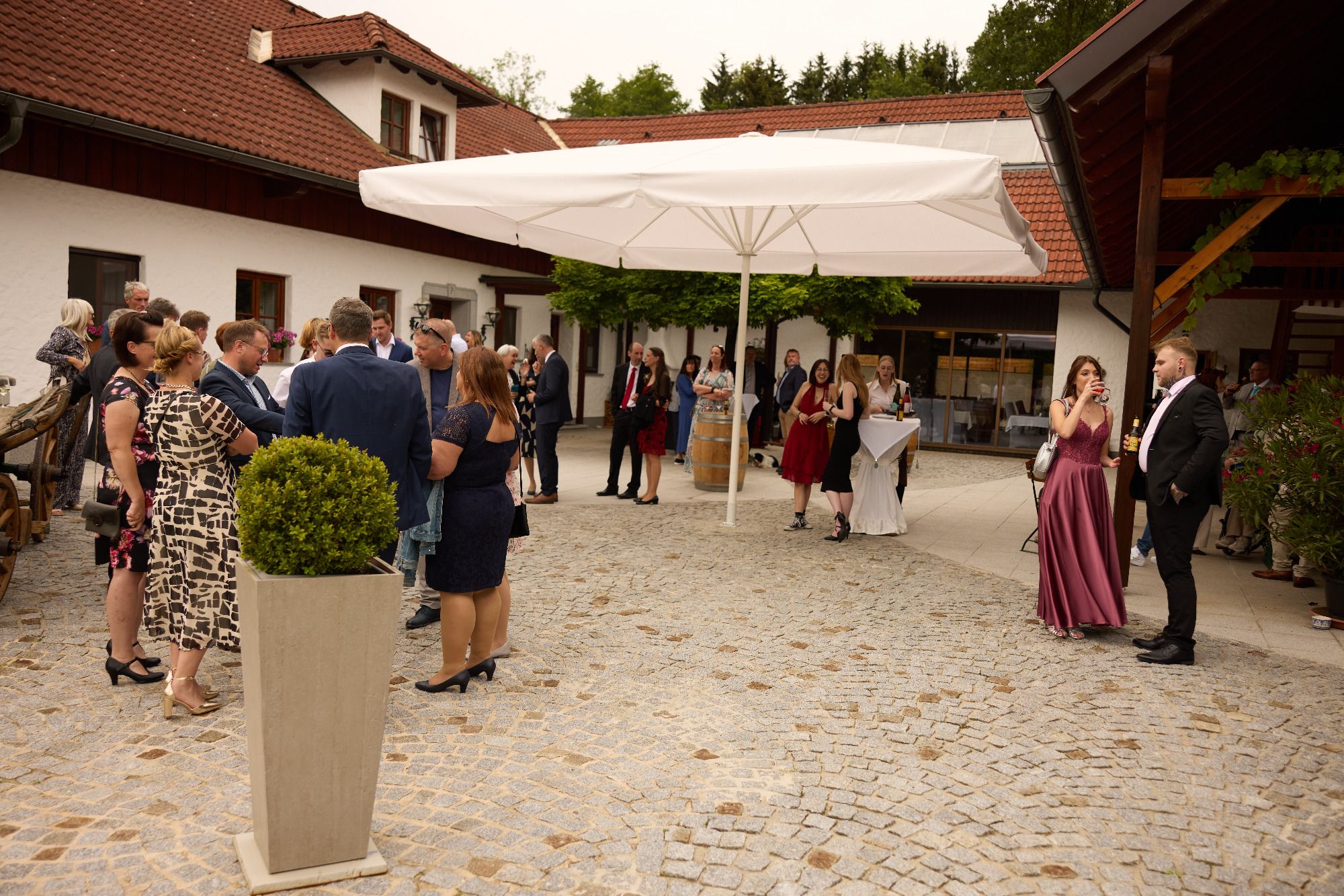Es derfts jetzt dann nämlich des frisch vermählte Brautpaar beim Sekt empfangen. Da nehmen se a gern nu gleich die Glückwunsche entgegen. Da Fotograf druckt a nu glei a paar Mal bei de Gruppenfotos ab. Um ca. 18:00 gibt’s dann für olle das heiß ersehnte Abendessen. So i glaub jetzt haben mas owa a.