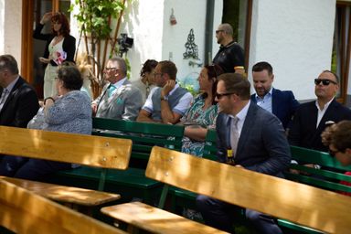 Liebe ist: Ein Gefühl dass ich nicht beschreiben kann, aber ganz tief in meinem Herzen ist. Host du ma Walter geantwortet auf mei Frag – was Liebe den für enk bedeutet. Und mit dem Gefühl des ma oft net beschreiben kann, mit eichana gemeinsamen Liebe zueinander, seits heit do glont, vor mir. Njo oda wie host du Bettina bei unserm Gespräch so sche zum Walter gsogt: du host me überred deswegen bin i heit do. Owa wie du eh scho so sche de Erfahrung mocha host derfn, is gut dass de „überreden“ lossn hast zum heiraten. Sonst wär vermutlich eh täglich von Walter nur kema, „TIK-TAK“ – die Zeit läuft. Heit läuft a die Zeit, owa für enk! Heit hoidn mas an, drucken Pause am hoffentlich schensten Tag enkares Lebens. Es soids na genießen, aufsaugen und nu ewig davon zehren kina.
