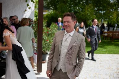 I muss an der Stelle nu glei erwähnen wie wir eigentlich zom gfundn hom: Bettina hod me angrufn und gfragt ob i fia des Datum nu frei wär. Als i des dann bejaht hob hobe gsogt i dads gern amoi treffen weile Leute immer gern gleich persönlich kennenlern damit i woas wies so drauf san. Bettina hod dabei herzlich glocht und gsagt: „Haha, schräg“.. Des habe soo symphatisch gfundn dass i gwisst hab des Brautpaar mecht i trauen.