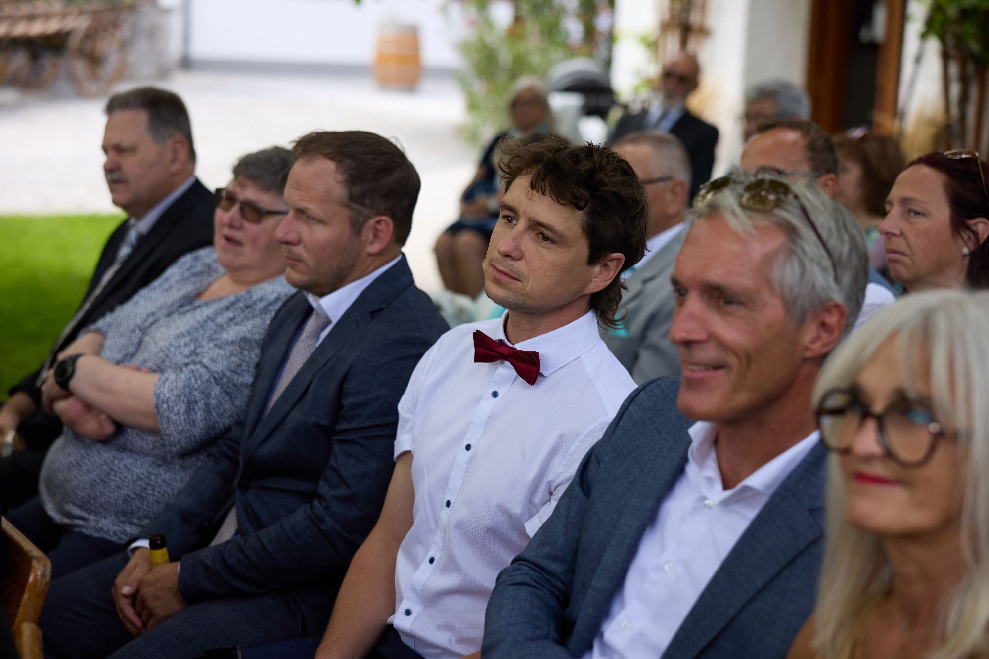 Bettina – beim Heiratsantrag woast so überrascht wie ma gheat hom, dassd net glei mit einem Ja geantwortet host. I hoff dass des heut ois net ganz so überraschend ist für dich und du ein klares JA auf mei Frage antwortest. Owa bevor ma zu der wichtigen Frage keman, habts enk ihr beide dazua entschlossen, dass enk vor euren Lieblingsmenschen numoi tief in Augen schaun und enka Herz öffnen wollts mit persönliche Worte füreinander. Bettina i hoff es geht a ohne Schnaps.